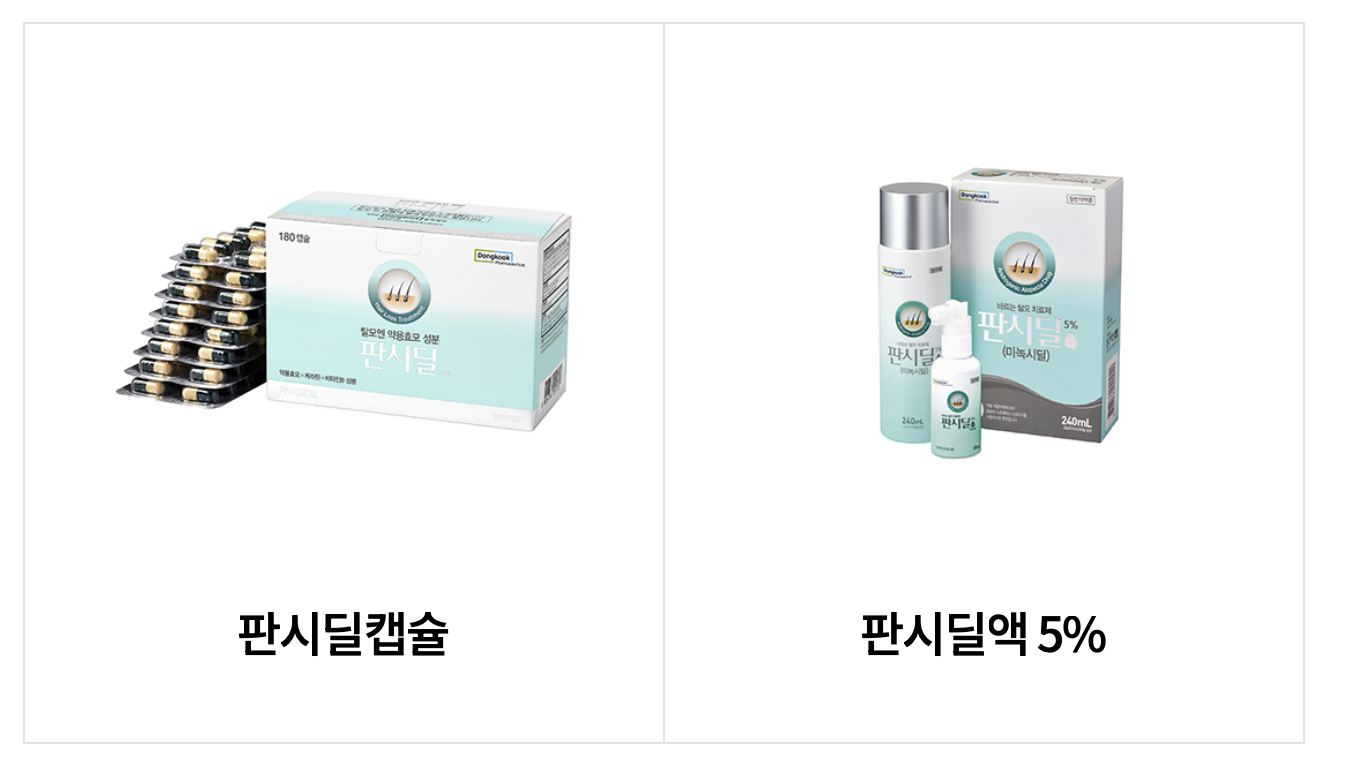 캡슐 외에도 판시딜액이라 불리는 바르는 제품도 존재합니다. 이 제품은 5%의 미녹시딜 성분이 포함된 액상 제형으로, 두피에 직접 바릅니다. 30ml 한 병 기준 2만~3만 원대에 판매되며, 비교적 저렴하고 한 달 분량으로 적합합니다.